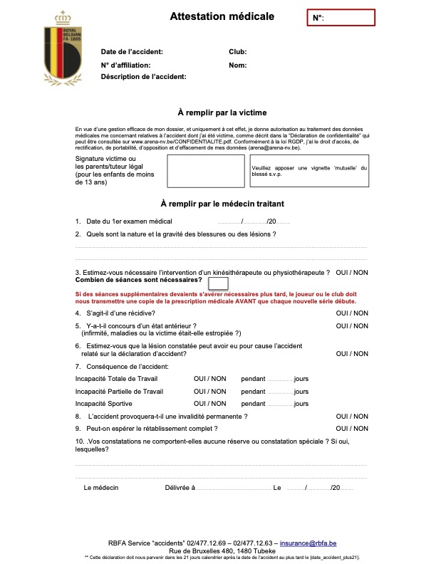En cas d’accident, voici la déclaration à faire remplir par le médecin.